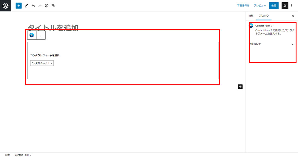 ブロックの挿入は+アイコンをクリックしてブロックを挿入。赤枠の中から「Contact Form 7」を選択。