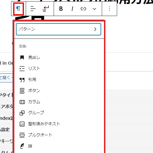 挿入するブロックを間違えた場合は、他のブロックに変更できる。があまり選択肢の幅はない。よく使うブロックに限られる。その為このブロックを削除して改めて選択し直す必要があります。