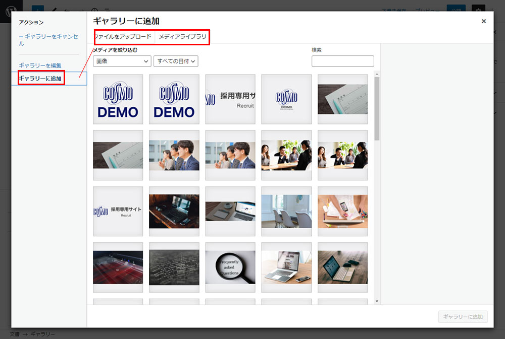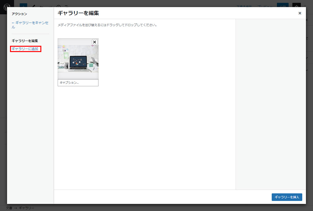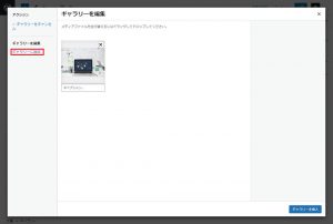 画像を1枚追加後新たに登録する場合、「ギャラリーに追加」をクリックで新たにメディアライブラリー・アップロードが出来ます。例としてメディアライブラリに登録されている1枚の画像とアップロードする画像が2枚など複数個所より作成する場合など考えられます。