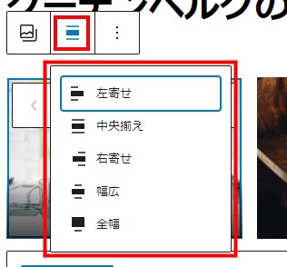 画像の配置を画面いっぱいの「全幅」、コンテンツ幅いっぱいの「幅広」の2種類から選択が可能。また、 左寄せ・中央寄せ・右寄せの3種類から選択できます。