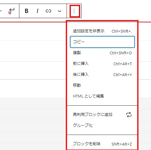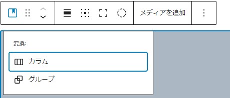再利用ブロックに追加:該当ブロックを登録して再利用が行えるように登録する。※テーマプラグインにより表示されない場合がある。