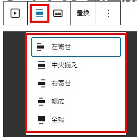 動画の配置を画面いっぱいの「全幅」、コンテンツ幅いっぱいの「幅広」の2種類から選択が可能。また、 左寄せ・中央寄せ・右寄せの3種類から選択できます。