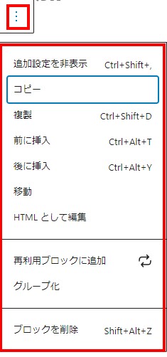 再利用ブロックに追加:該当ブロックを登録して再利用が行えるように登録する。※テーマプラグインにより表示されない場合がある。