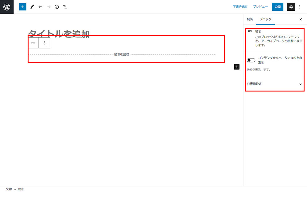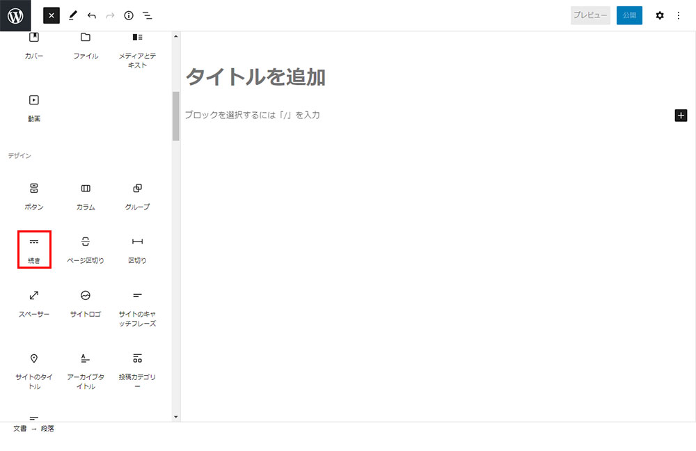 ブロックの挿入は+アイコンをクリックしてブロックを挿入。赤枠の中から「続き」を選択。