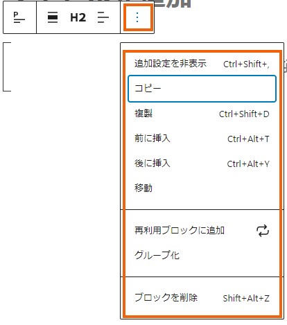 前に挿入:現在のブロックの前に新たなボックスを挿入することが出来ます。