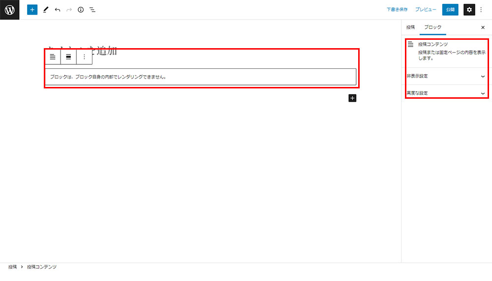 ブロックの挿入は+アイコンをクリックしてブロックを挿入。赤枠の中から「投稿コンテンツ」を選択。