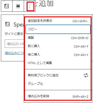 再利用ブロックに追加:該当ブロックを登録して再利用が行えるように登録する。※テーマプラグインにより表示されない場合がある。