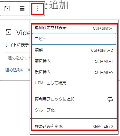 再利用ブロックに追加:該当ブロックを登録して再利用が行えるように登録する。※テーマプラグインにより表示されない場合がある。