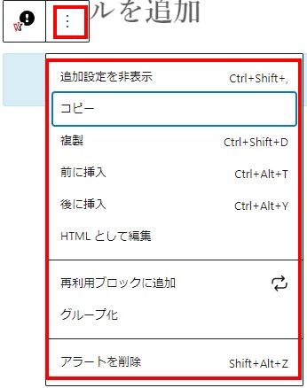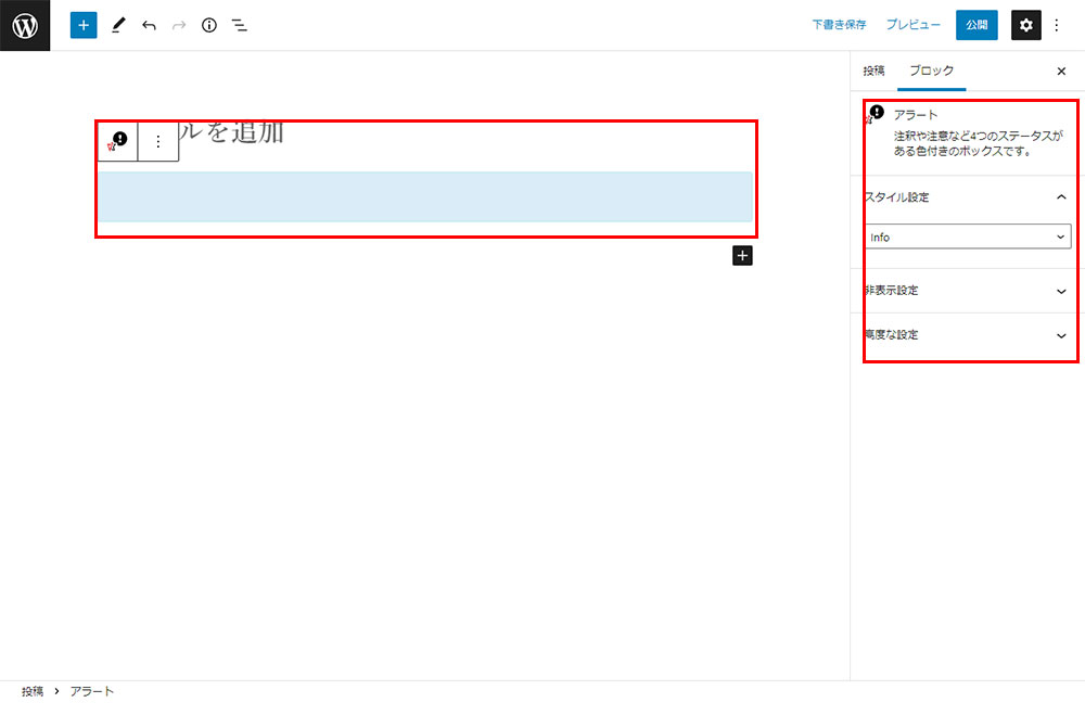 ブロックの挿入は+アイコンをクリックしてブロックを挿入。赤枠の中から「アラート」を選択。