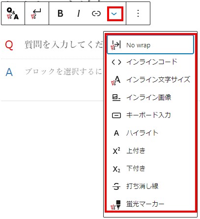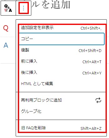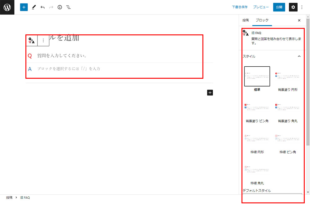 ブロックの挿入は+アイコンをクリックしてブロックを挿入。赤枠の中から「旧 FAQ」を選択。
