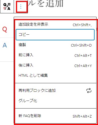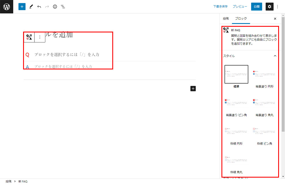 ブロックの挿入は+アイコンをクリックしてブロックを挿入。赤枠の中から「新 FAQ」を選択。