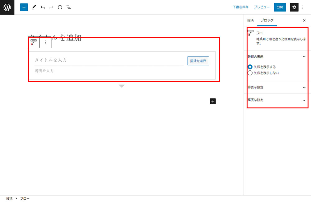 ブロックの挿入は+アイコンをクリックしてブロックを挿入。赤枠の中から「フロー」を選択。