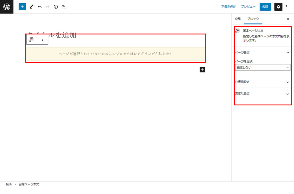 ブロックの挿入は+アイコンをクリックしてブロックを挿入。赤枠の中から「固定ページ本文」を選択。