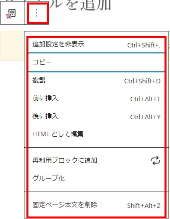 固定ページ本文現在選択されているブロック名
