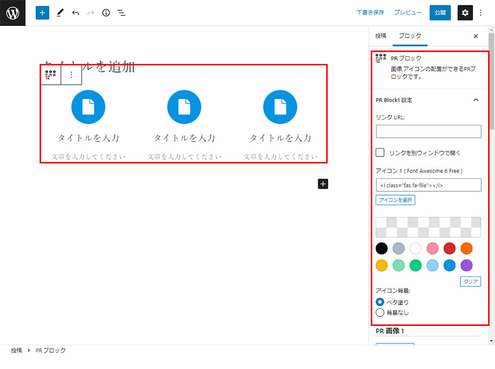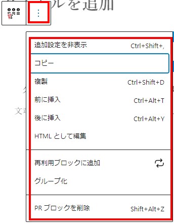 ブロックの挿入は+アイコンをクリックしてブロックを挿入。赤枠の中から「PR ブロック」を選択。