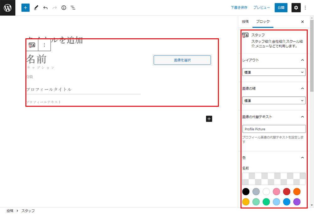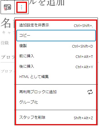 ブロックの挿入は+アイコンをクリックしてブロックを挿入。赤枠の中から「スタッフ」を選択。