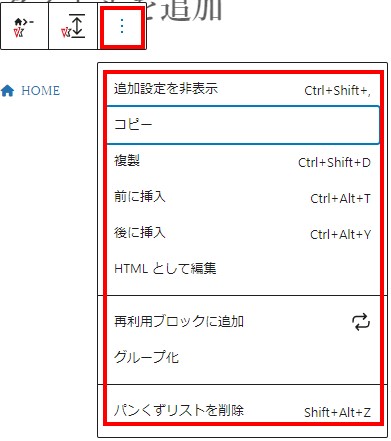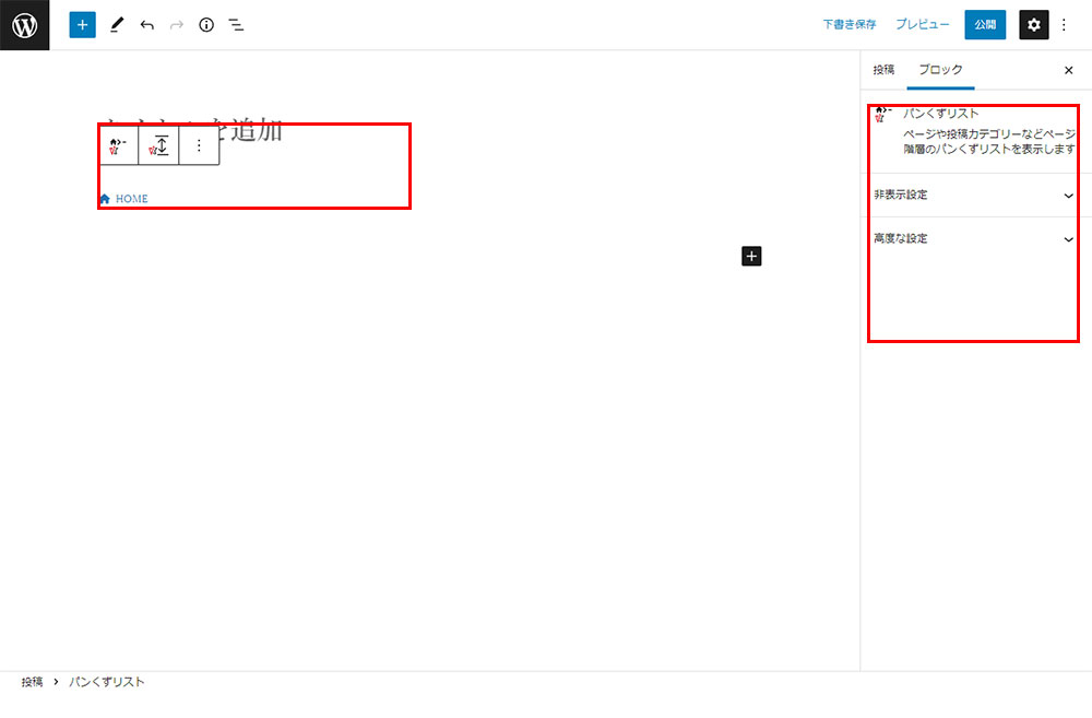 ブロックの挿入は+アイコンをクリックしてブロックを挿入。赤枠の中から「パンくずリスト」を選択。