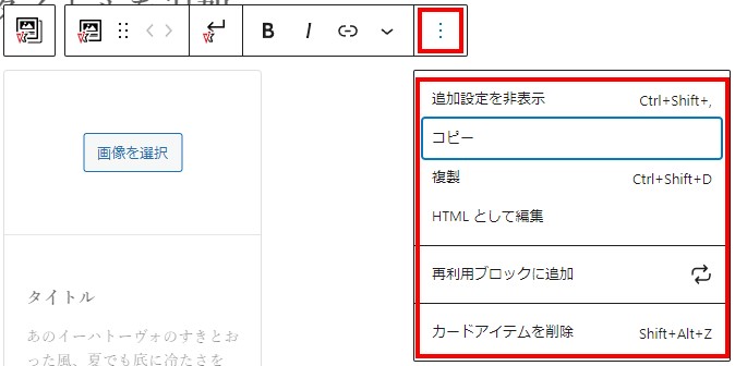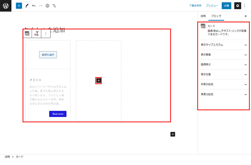 ブロックの挿入は+アイコンをクリックしてブロックを挿入。赤枠の中から「カードアイテム」を選択。