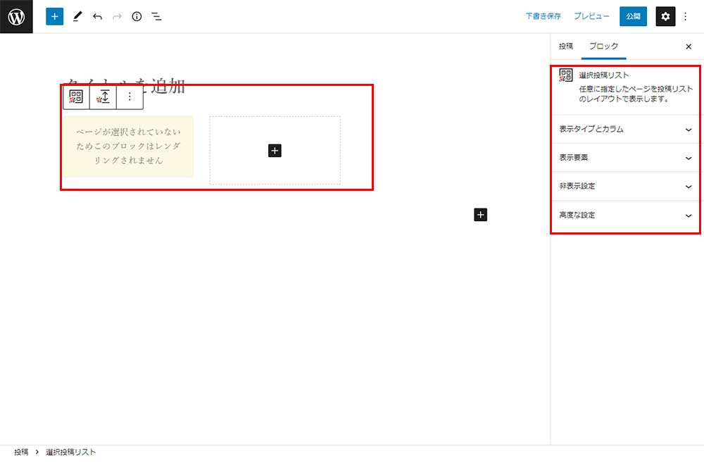 ブロックの挿入は+アイコンをクリックしてブロックを挿入。赤枠の中から「選択投稿リスト」を選択。