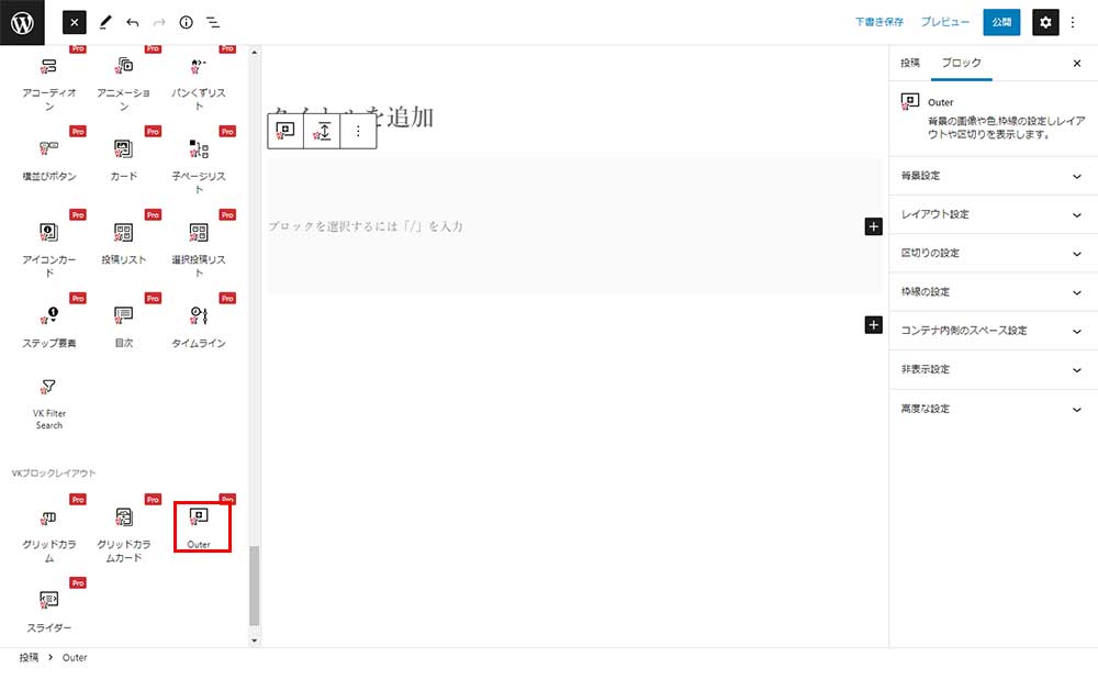 - ブロックエディタ(Gutenberg)VKブロックPRO Outerの使い方を紹介します。