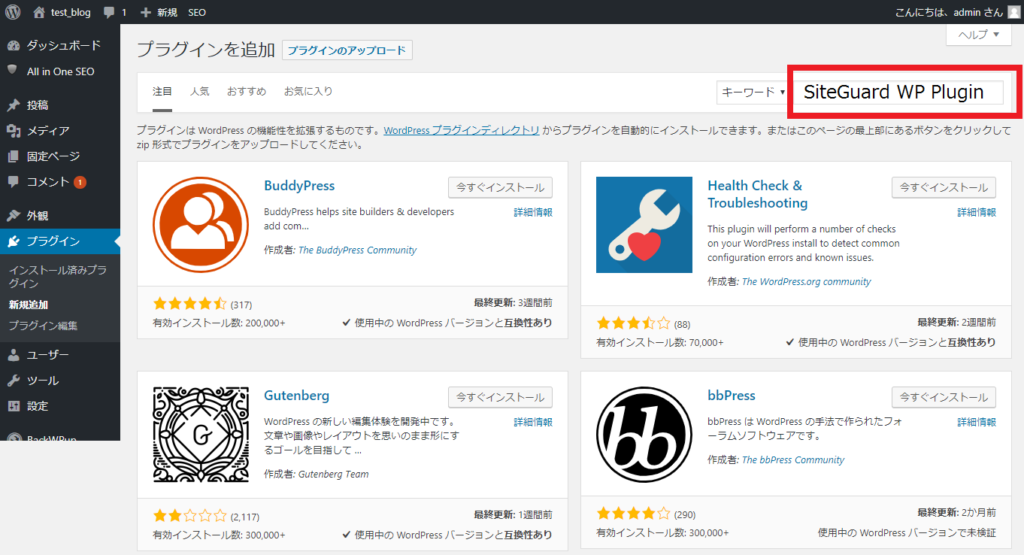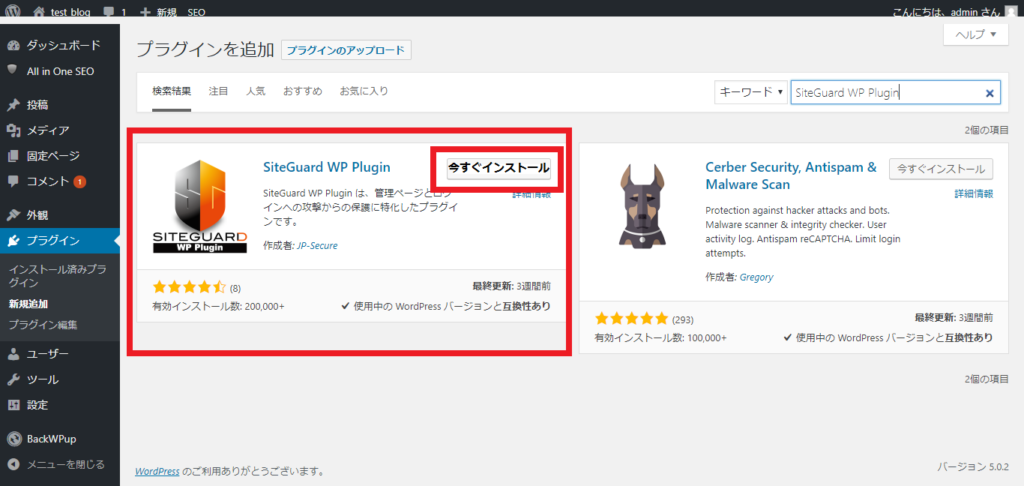 検索結果に「SiteGuard WP Plugin」が表示される。「SiteGuard WP Plugin」欄の「今すぐインストール」をクリック