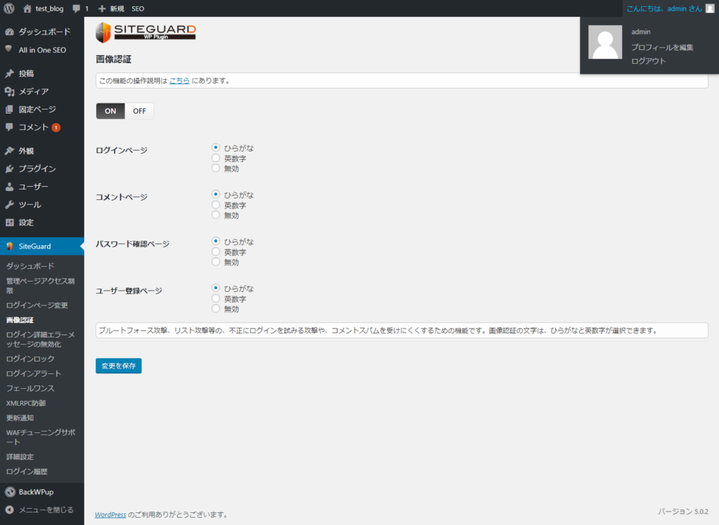 なおSiteGuard WP Pluginを有効化した時点で画像認証も有効になっていますが、あとから設定を変えることもできます。設定方法は以下の通りです。