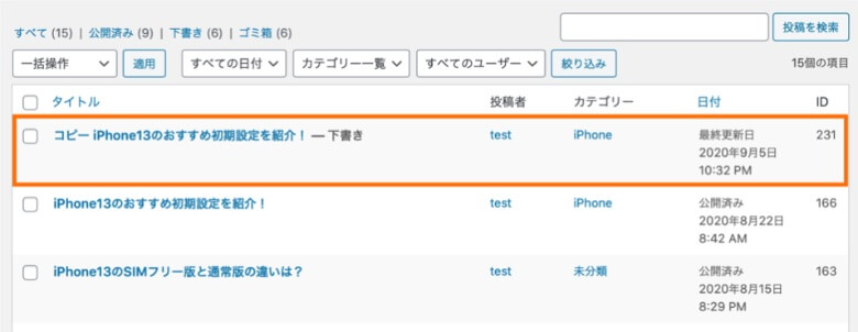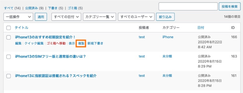 投稿一覧の画面を開き、複製したい記事にカーソルを当てると、「複製」ボタンが表示されます。