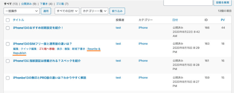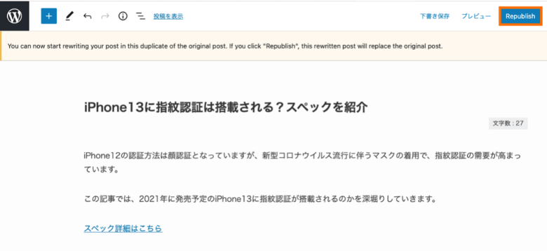 後はRewrite & Republish機能によりマージされた複製元の記事で、更新をしましょう。