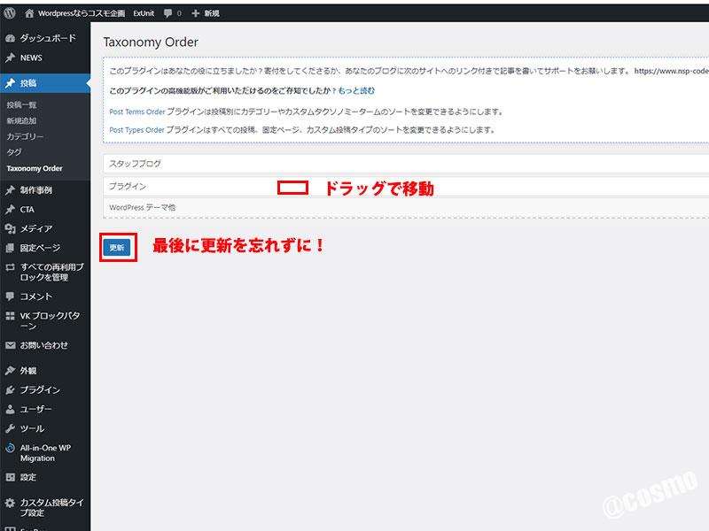 該当タクソノミーをドラッグ(クリックしたまま移動)して表示順を指定。