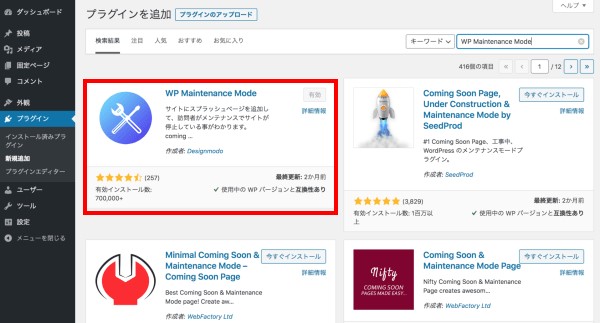 プラグインの一覧画面で「WP Maintenance Mode」を有効化します。
