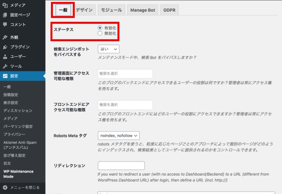 WordPressダッシュボードの「設定から」、「WP Maintenance Mode」を選択します。