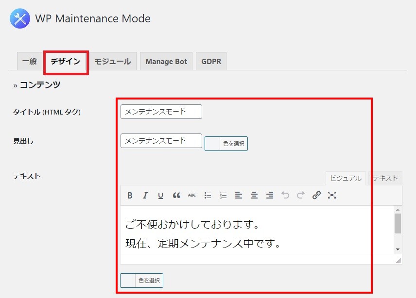デザインタブをクリックするとメンテナンスモードの画面で表示されるタイトルや文章の他、背景画像等も変更ができます。
