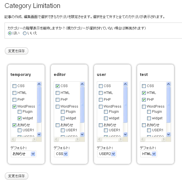 初期設定は特別ななき、ユーザー毎に許可するカテゴリにチェックを入れます。