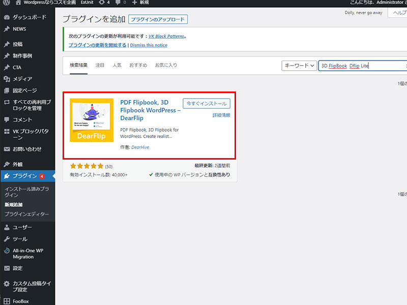 プラグイン「新規追加」より「3D FlipBook」 と入力ご検索後インストール。