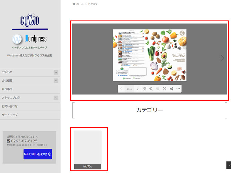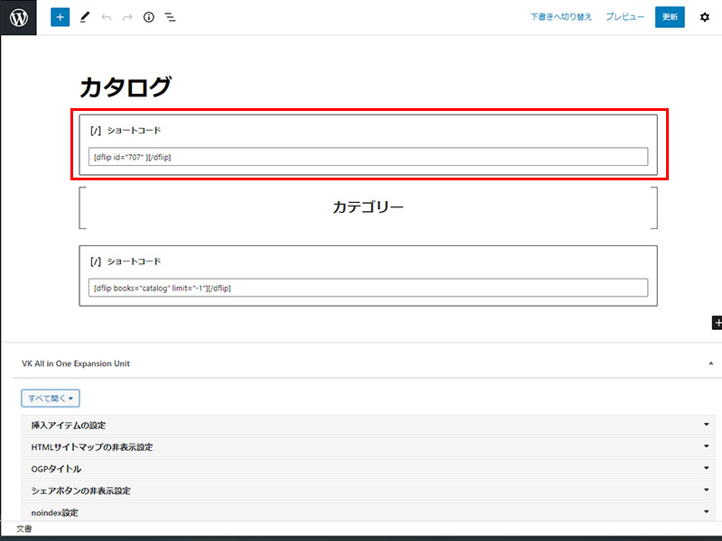 固定ページにカタログ(仮定)のページを作成し、そのページに表示させる場合先ほどのショートコードを張り付ける事で表示することが出来ます。