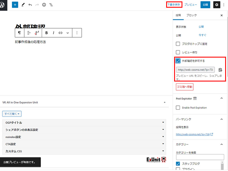 記事を「下書き」「予約投稿」「レビュー待ち」に設定すると、投稿画面に「外部確認を許可する」という項目が表示されます。赤枠内を注目。