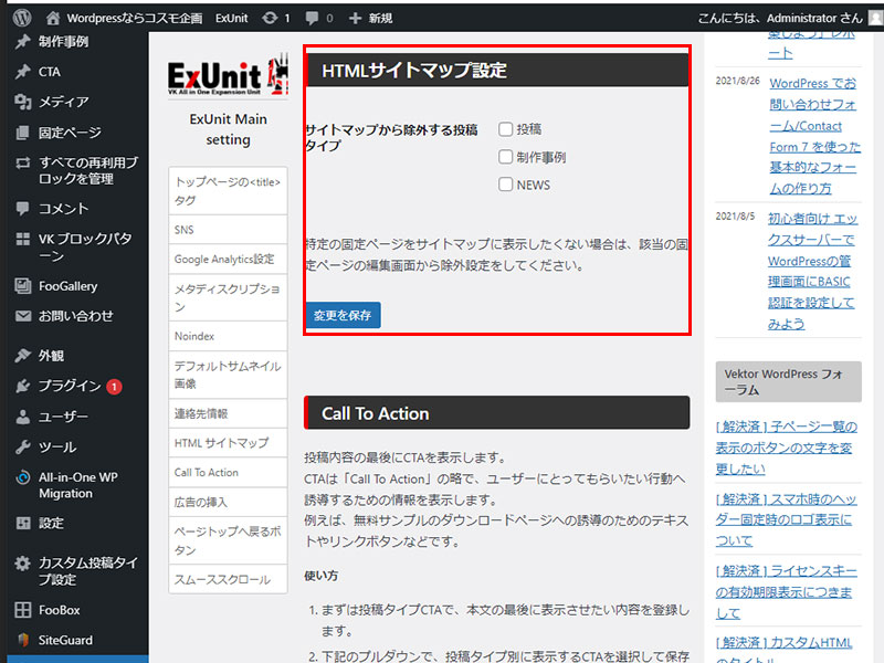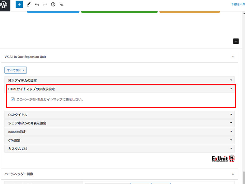 投稿・カスタム投稿はダッシュボード>ExUnit>HTMLサイトマップ設定の順に進み該当をCHECKつける(右図の赤枠の通り)。ただしカテゴリー単位には設定はできない。要注意