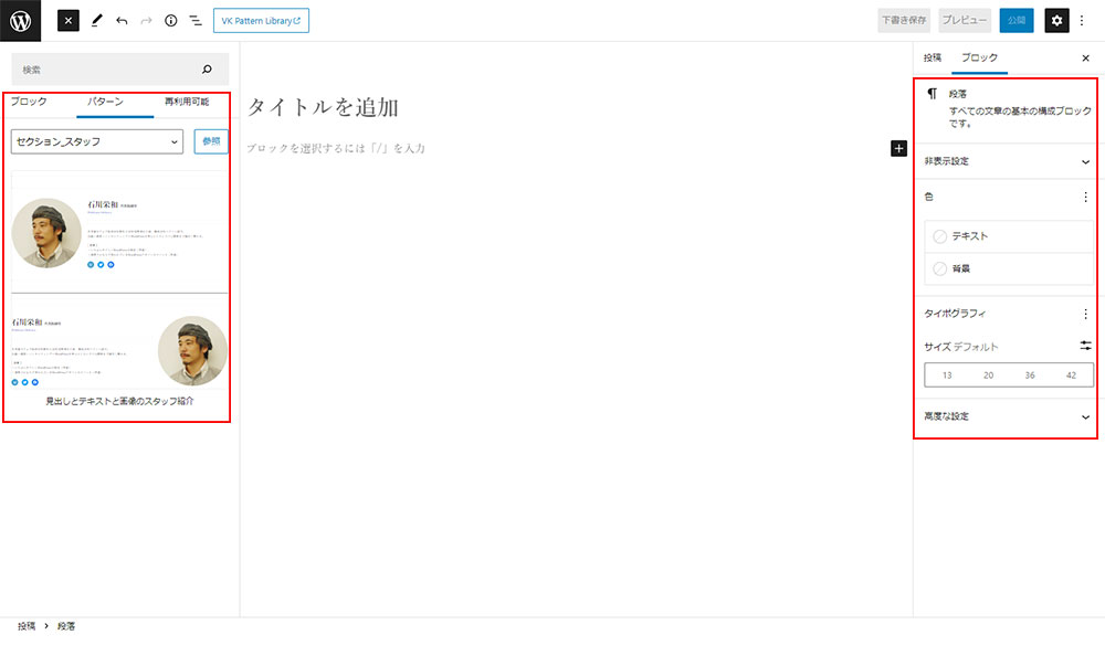 - ブロックエディタ(Gutenberg)VK Block Patterns セクション_スタッフ(見出しとテキストと画像のスタッフ紹介)の使い方がわからない?
