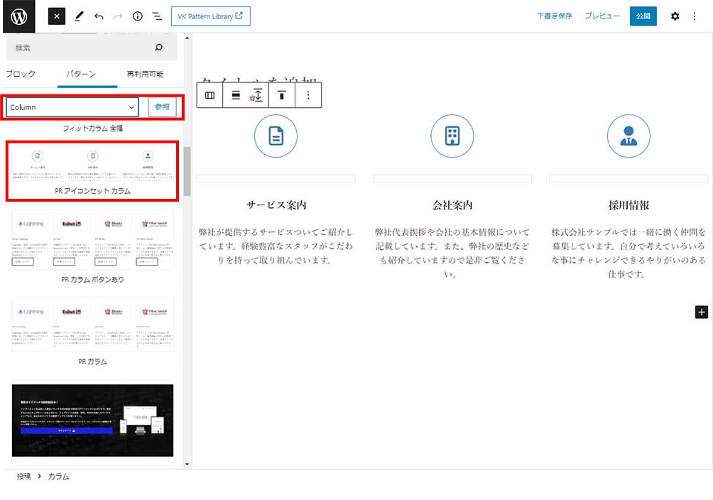 - ブロックエディタ(Gutenberg)VK Block Patterns Column(PR アイコンセット カラム)の使い方がわからない?