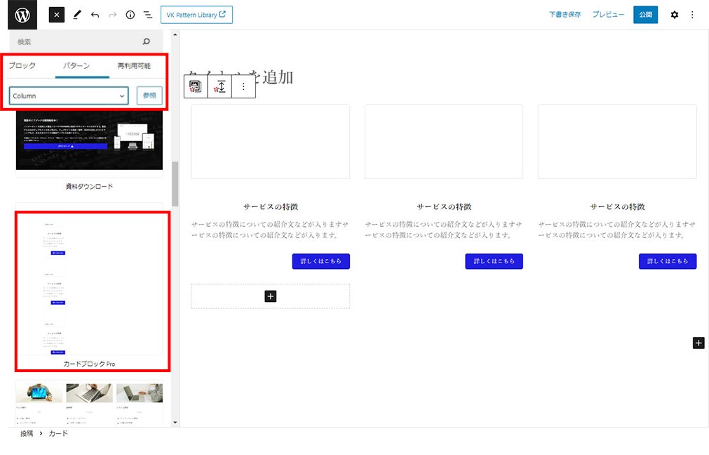 - ブロックエディタ(Gutenberg)VK Block Patterns Column(カードブロック Pro)の使い方を紹介します。