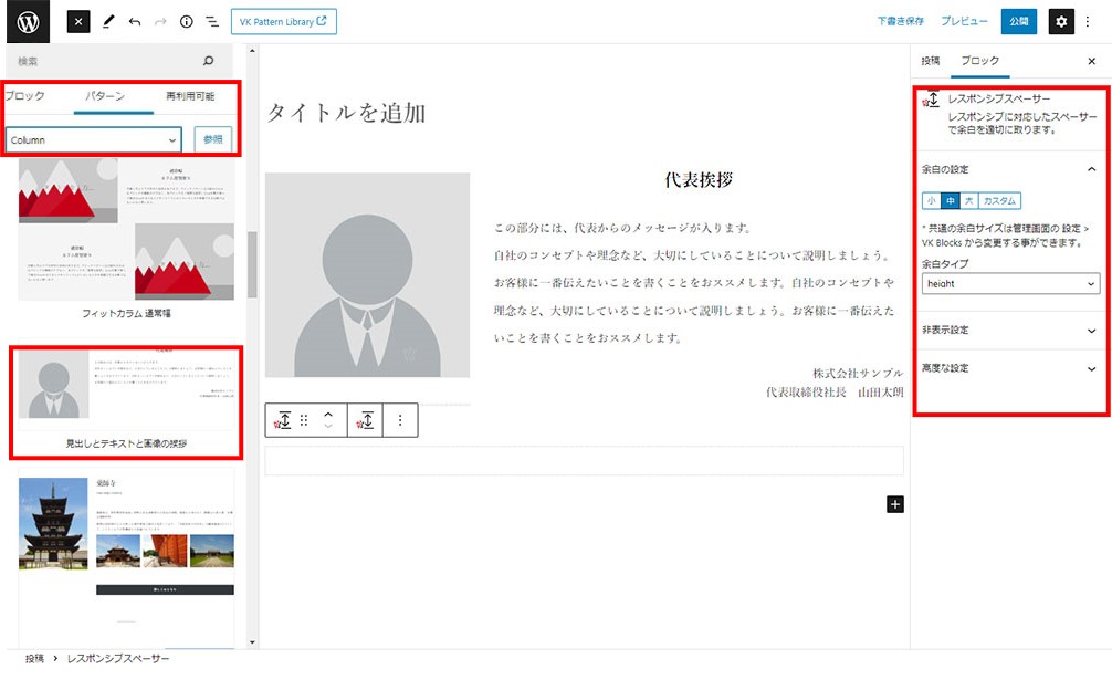 - ブロックエディタ(Gutenberg)VK Block Patterns Column(見出しとテキストと画像の挨拶)の使い方がわからない?