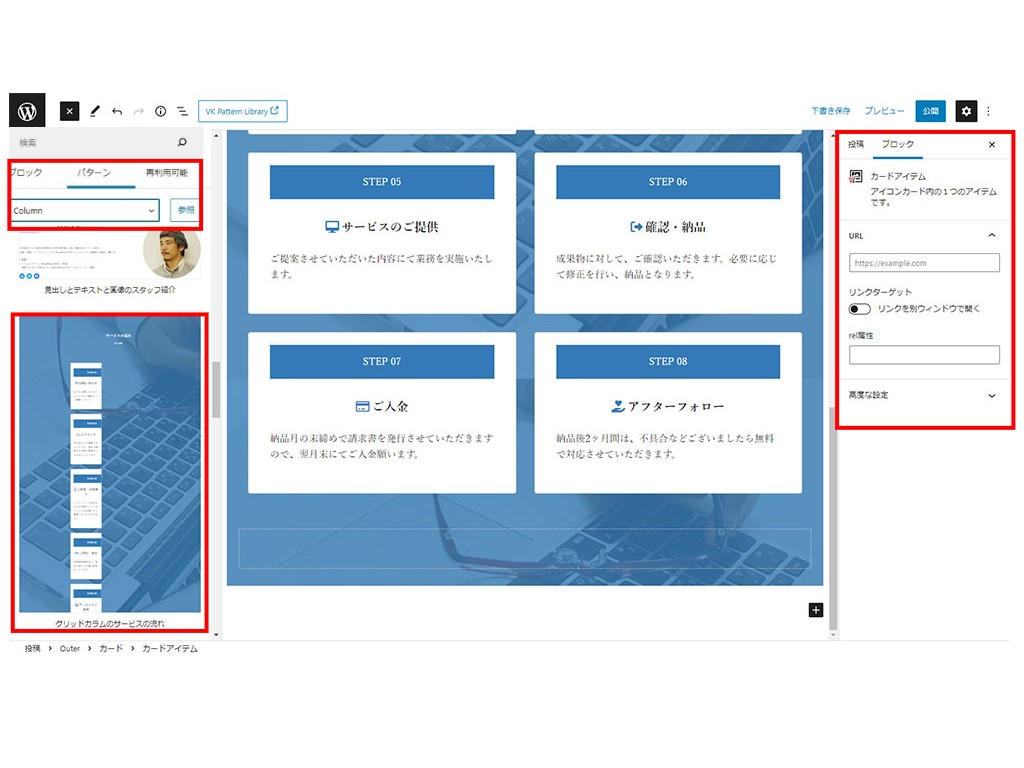 - ブロックエディタ(Gutenberg)VK Block Patterns Column(グリッドカラムのサービスの流れ)の使い方がわからない?