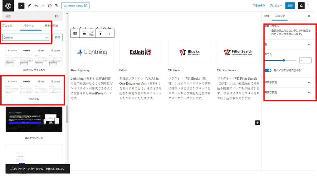 - ブロックエディタ(Gutenberg)VK Block Patterns Column(PR カラム)の使い方を紹介します。