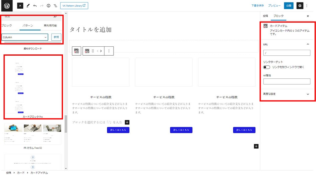 - ブロックエディタ(Gutenberg)VK Block Patterns Column(カードブロック Pro)の使い方の使い方を紹介します。