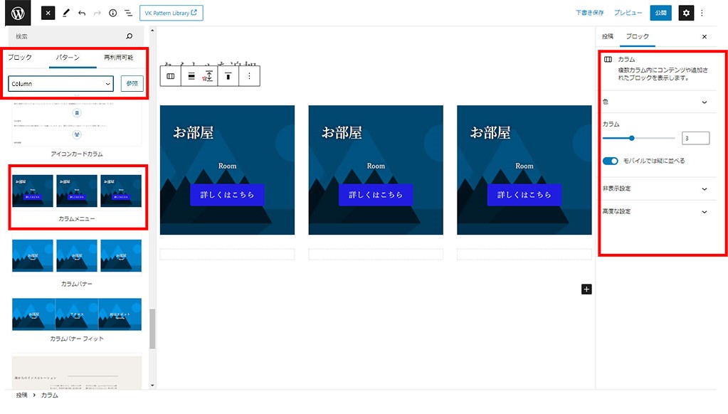 - ブロックエディタ(Gutenberg)VK Block Patterns Column(カラムメニュー)の使い方を紹介します。