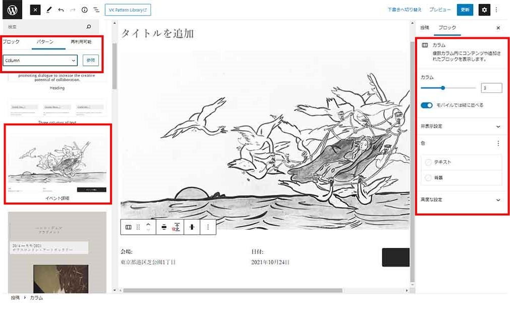 Wordpress 使い方マニュアル:テキスト(イベント詳細)真ん中のパターンを選択