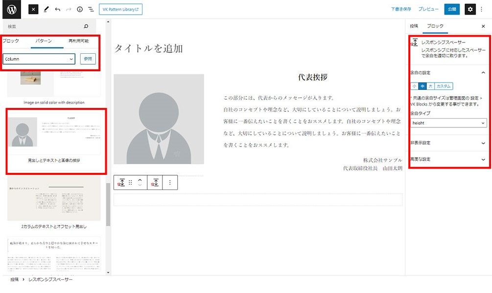 • ブロックエディタ(Gutenberg)VK Block Patterns テキスト(見出しとテキストと画像の挨拶)の使い方を紹介します。