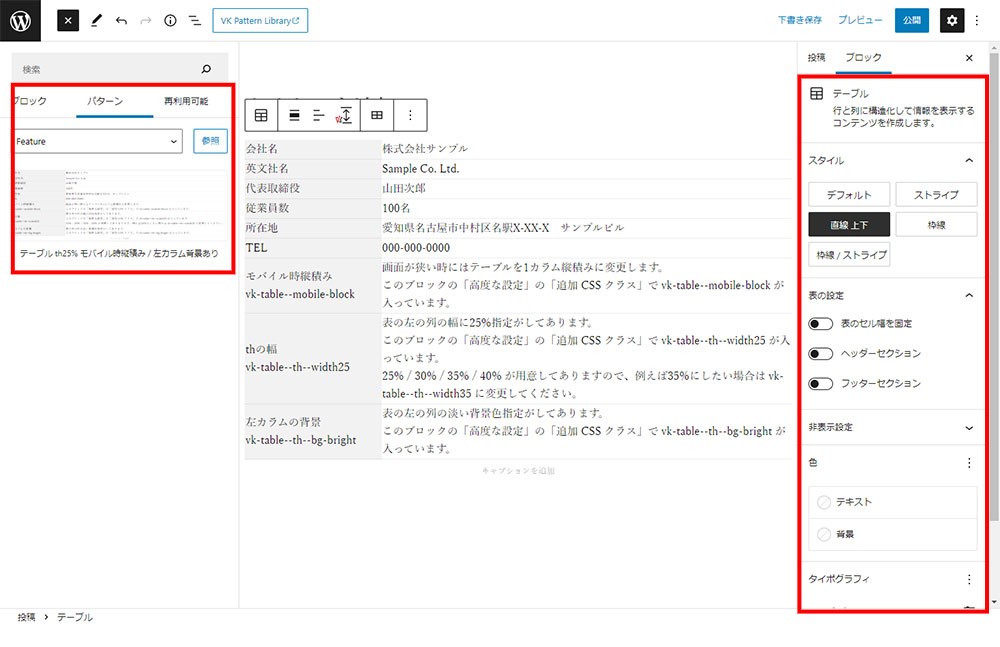 - ブロックエディタ(Gutenberg)VK Block Patterns feature(table th25% モバイル時縦積み/左カラム背景あり)の使い方がわからない?
