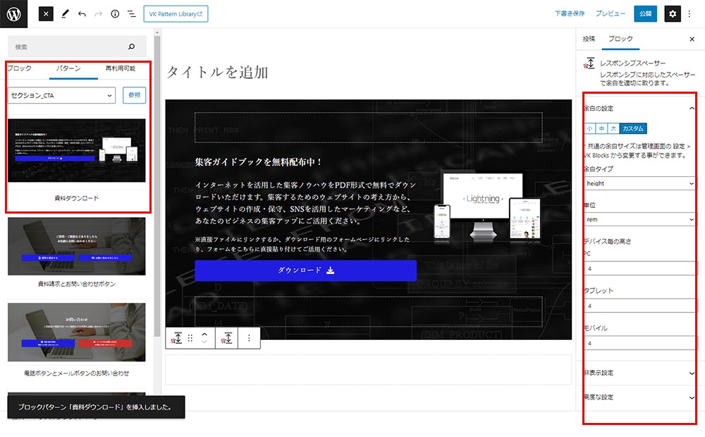• ブロックエディタ(Gutenberg)VK Block Patterns セクション_CTA(資料ダウンロード)の使い方を紹介します。