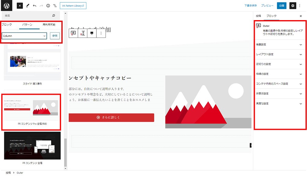 • ブロックエディタ(Gutenberg)VK Block Patterns セクション_PR(PR コンテンツ Pro 全幅 斜め)の使い方がわからない?